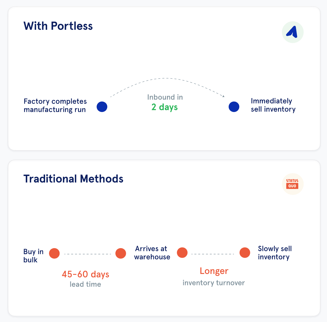With Portless, most international orders arrive in five to eight business days — fast enough to set a credible promise in most markets.